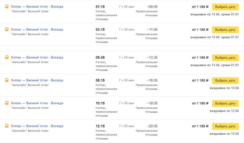 Ниже приведена информация о том, сколько часов вам потребуется, чтобы добраться от Котласа до Вологды, а также приведена примерная стоимость проезда (средняя цена билета) на том или ином виде транспорта.