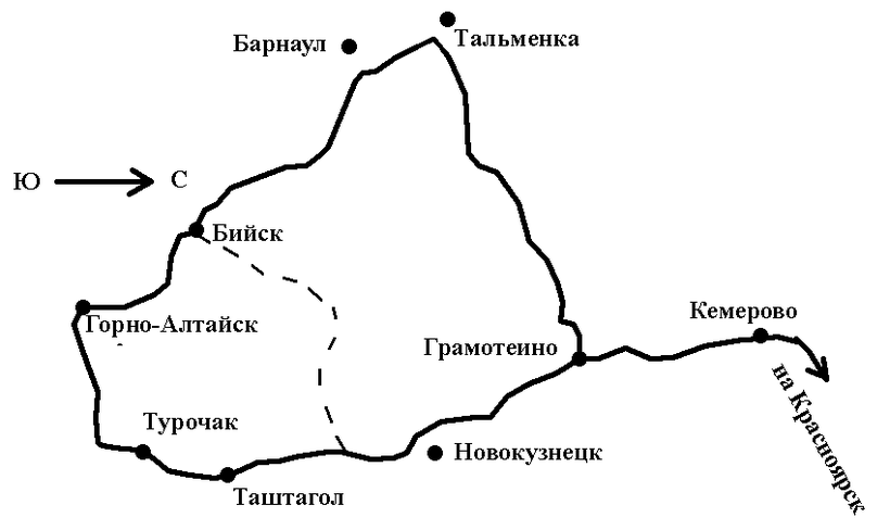 Первый вариант Горно-Алтайск – Бийск – мимо Барнаула – возле Тальменки – Грамотеино – на Кемерово.