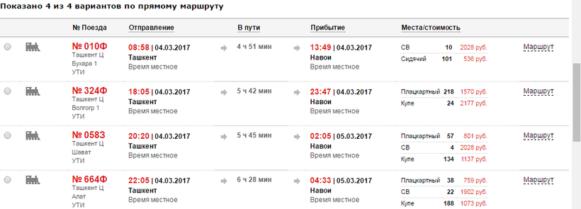 В Ташкенте неплохо развита транспортная сеть, так что советую вам задуматься о поездке по железной дороге, так как поезда ходят ежедневно и стабильно, да и стоимость, по правде говоря, невысокая. Я покажу вам расписание на 4 февраля, но при желании вы можете посмотреть на сайте РЖД график на любой другой день. Будет 4 рейса: