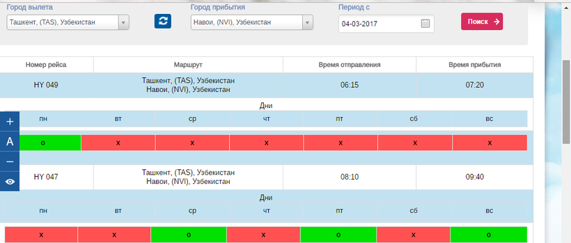 А вот самым быстрым вариантом будет перелет. В Ташкенте, как и в Навои, есть свой аэропорт, но самое главное, что между городами выполняются прямые рейсы. В качестве примера я покажу вам сезонное расписание вылетов. Кстати, зеленым цветом обозначаются дни, на которые есть вылеты, а красным, когда их нет. Осуществляются вылеты всего лишь дважды в день: