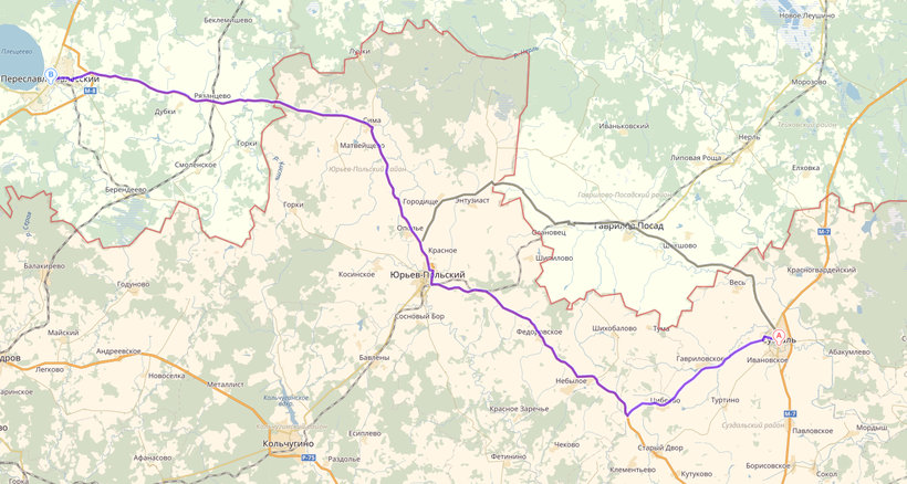 Расстояние между Суздалем и Переславль-Залесским составляет 104 километра или 65 миль по прямой и 128 километров или 79 миль по автодорогам.