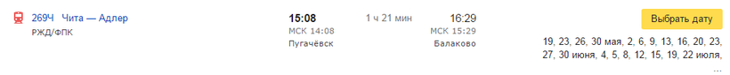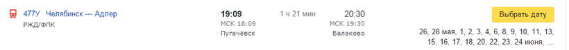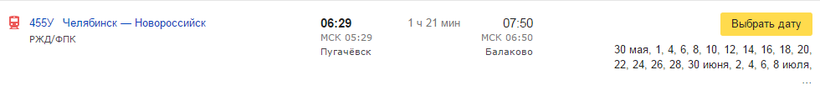 По четным числам в любое время года между этими городами проходит электричка из Ершово. С железнодорожной станции, которая называется Пугачевск, она отправляется в 17:07, а уже в 18:17 она прибывает в Балаково. С мая по октябрь здесь проходят поезда в южном направлении до Новороссийска и Адлера, которые останавливаются тоже на нужных нам станциях. Всего из Пугачева можно доехать в Балаково на 3 рейсах ежедневно утром, днем и вечером. Добираться на них придется немного дольше, чем на электричке, около 1,5 часов.