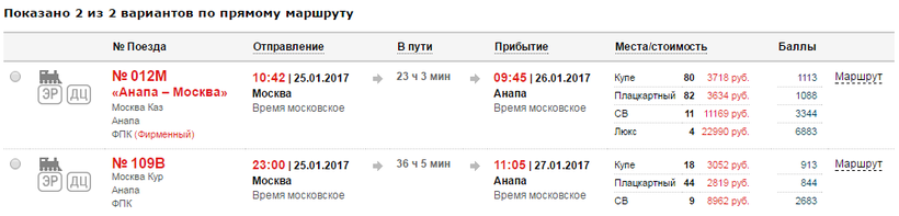 Из всех вариантов предпочтительней первый, так как рейсы в Анапу выполняются чаще. Можно даже расписание глянуть, к примеру, на завтра есть два прямых рейса, которые есть ежедневно. Первый поезд отправляется от Казанского вокзала в 10:42, в пути он проведет 23 часа.