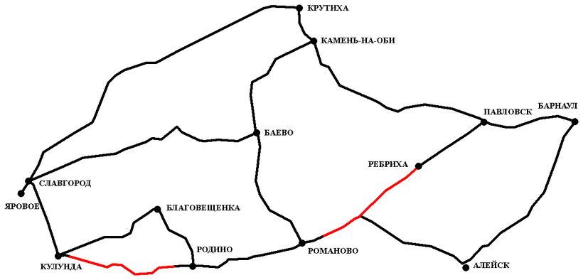 Дело в том, что пути "Яровое – Славгород – Баево – Камень – Барнаул", " Яровое – Славгород – Крутиха – Камень – Барнаул" и "Яровое – Славгород – Кулунда – Романово – Павловск - Барнаул" отличаются друг от друга по длине всего на 2 километра! Это при 420 км длины. Путь через Алейск на 60 км дольше, но зато дорога "Алейск - Барнаул" всегда очень хорошая.