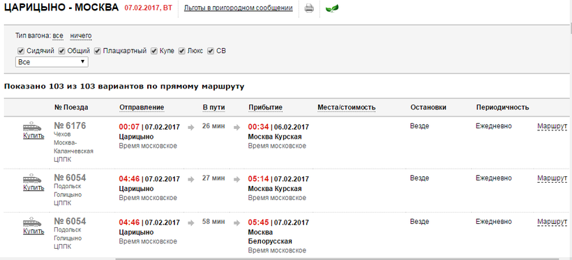 Если вас интересует вариант с автобусом, тогда придется сначала добраться в Москву, так как рейсов из Царицыно в Тулу нет, а потом уже дальше. Здесь вам поможет опять добрый старый вариант с электричкой. До Москвы они ходят ежедневно и есть более 100 рейсов, но чтобы вас не путать я покажу расписание на завтрашний день.