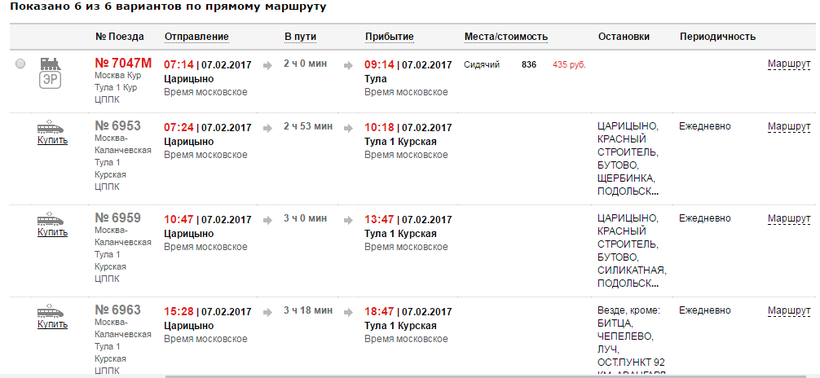 На скриншоте вы можете увидеть, что все электрички идут до Тулы по разному времени, это зависит от того, что некоторые из них не делают остановок на промежуточных станциях и это порой играет роль, так как сразу отпадает лишний час в дороге.