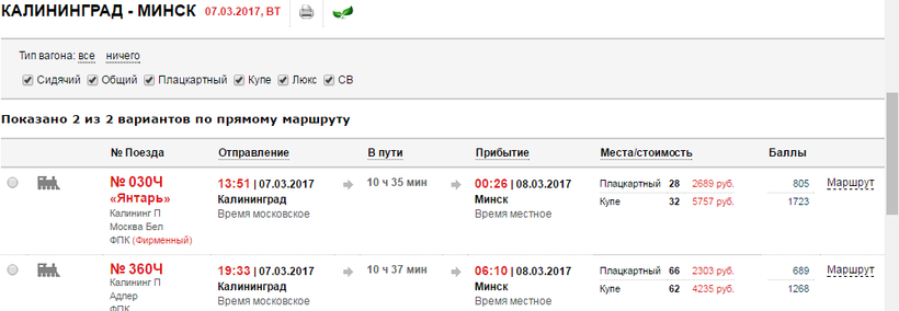 Поскольку у меня нет своего транспорта, то всегда приходится искать другие варианты, которые будут не только удобными, но и не слишком затратными. В этот раз особо выбора не было, так как ехала я не одна и ничего иного не оставалось, как настроить себя на поездку поездом. Забегая вперед скажу, что доехать можно только с пересадками. Для начала вам необходимо оказаться в Калининграде, а поскольку между ним и Светлогорском 40 километров, то доехать можно даже на такси (400 рублей). Чтобы вы сами увидели расписание, я взяла 7 марта, так как на этот день будет 2 рейса: