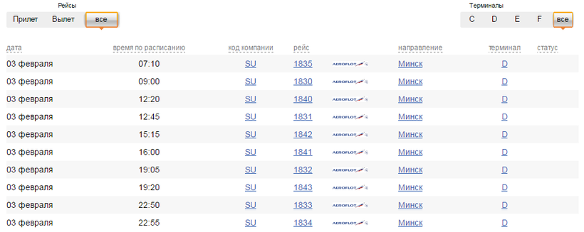 Предположим, что вы прилетели в Шереметьево 3 февраля. На этот день есть несколько рейсов в течение дня до Минска. Первый оправляется рано утром в 07:10, а последний в 22:55. До Минска лететь еще около двух часов.