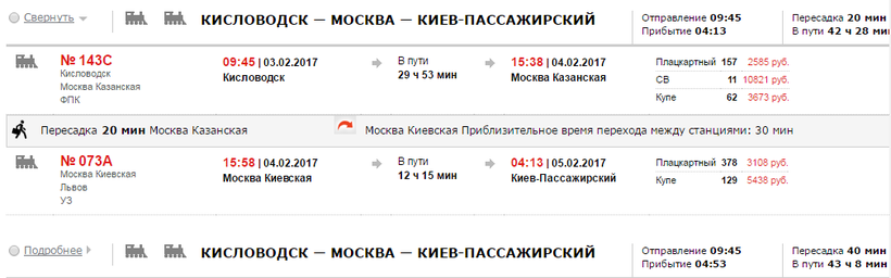 Дорога займет ровно сутки. Так же видно, что пересадку надо будет сделать в Москве, доехав до Казанского вокзала. А вот поезд в Киев будет отбывать от Киевского вокзала. У вас будет всего лишь 20 минут, чтобы крайне быстро успеть на поезд.