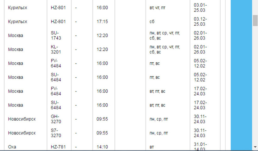 На нынешний день рейсы до Ханоя, да и вообще во Вьетнам выполняются в основном из Московских аэропортов. Так что из аэропорта Южно-Сахалинска надо лететь прямиком до Москвы и сразу же покажу сезонное расписание, чтобы вы видели, что рейсы есть часто и практически во все дни недели. Перелет займет 8 часов и можно сказать, что этого вполне достаточно, чтобы утомиться. Если вы прилетите утром или днем в Москву, то вам придется еще где-то переждать время до следующего рейса, учтите это.