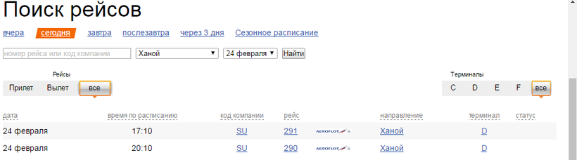 Ну а теперь о рейсах из Москвы, кстати, в качестве примера я взяла Шереметьево и завтрашний день. Вы можете увидеть, что есть всего лишь 2 авиарейса: