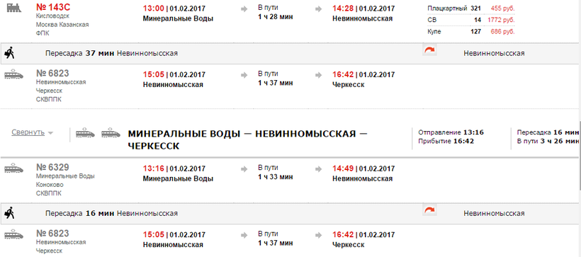 Я добиралась именно по железной дороге и, по правде говоря, мне такая поездка пришлась по душе. Во-первых, ехать хоть и с пересадкой, но всего лишь 3 с лишним часа, а во-вторых, я любовалась видами, а они там были просто потрясающими. Как вы уже поняли, будет пересадка, и сделать ее надо на станции Невинномысская. Поезда есть ежедневно, но всего лишь дважды в день. Бывает, что пускают дополнительный поезд из-за большой загруженности (в сезон). Итак, вот, к примеру, можете посмотреть расписание на 1 февраля, как раз будет два рейса: