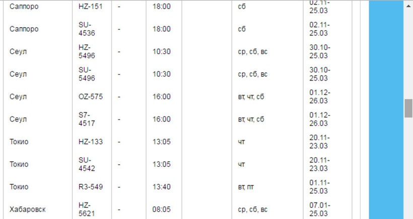 Из аэропорта Южно-Сахалинска регулярно выполняются прямые рейсы до Сеула. Ниже я прикреплю сезонное расписание, чтобы вы смогли увидеть дни, по которым бывают вылеты. Есть так же вариант лететь через Москву (если не будет рейсов), он больше всего подходит городам, расположенным в центральной России (вплоть до Урала), однако лучше всего добираться напрямую. Перелет занимает чуть больше 4 часов.
