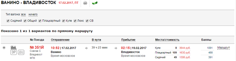 Порт Ванино находится в 1200 километрах от Владивостока, добраться до него можно на поезде, который курсирует несколько раз в неделю. На 17 число этого месяца будет как раз поезд в 10:52, который вас довезет до железнодорожного вокзала Владивостока. Как вы могли заметить, в пути вы проведете 1 день 16 часов.
