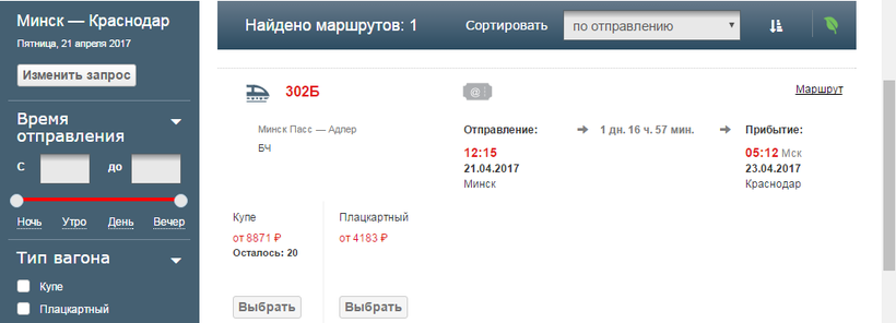 Несколько раз в неделю курсирует прямой поезд по маршруту Минск – Краснодар, который прибывает на место через 1 день 17 часов. Это намного удобнее автобусного варианта, в котором даже нельзя быть уверенным. Отправка осуществляется в 12:15. Также хочу добавить, что состав по данному направлению курсирует не новый, но удобный и чистый, по крайней мере, я с подругой легко перенесла дорогу.