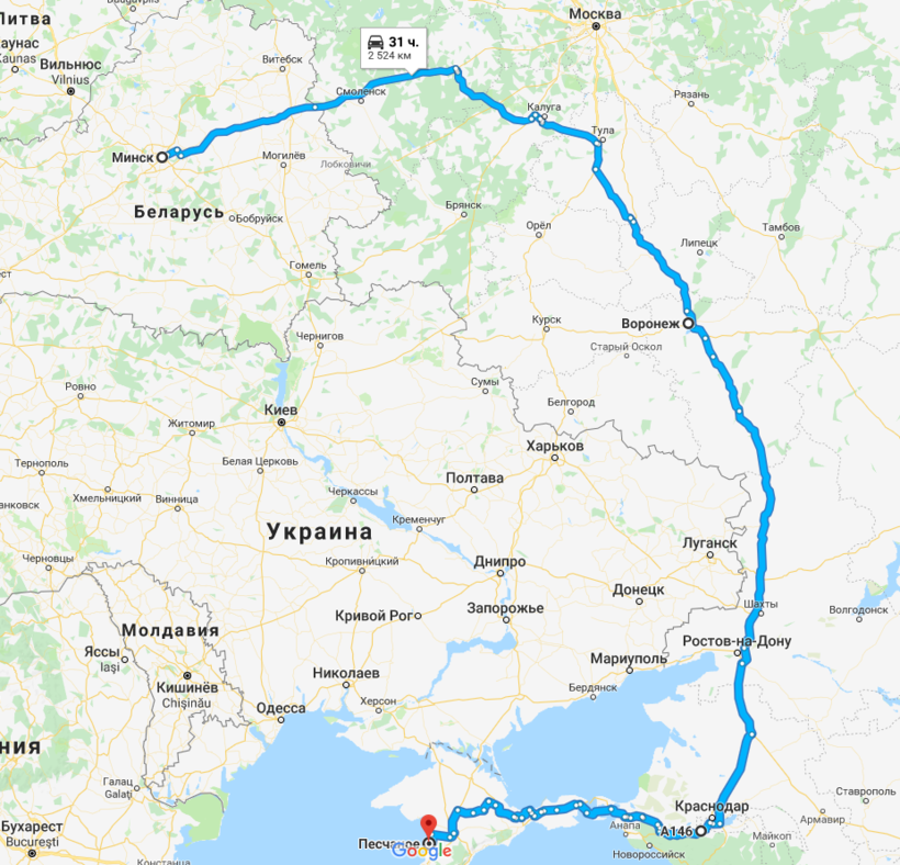 У нас было два водителя, отдыхали по очереди, поэтому путь до Анапы занял чуть более суток. Доехали бы ещё быстрее, но кое-где пробки, ремонт. Хотя качество дорог более-менее, я ожидала, что будет хуже. Далее переправились на пароме — кстати, очереди не было. Следующие — Симферополь и Песчаное.