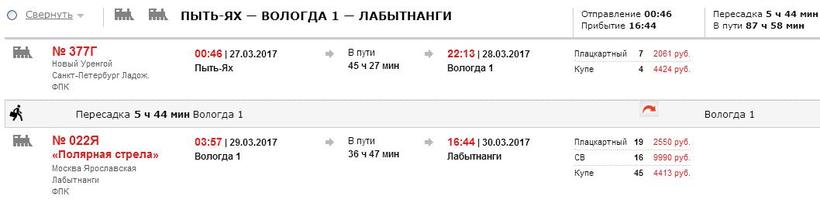 Прямого поезда, конечно нет. До станции Лабытнанги можно попасть с пересадкой: двое суток надо добираться до Москвы, оттуда мчится экспресс "Полярная стрела". Вот только билеты в летний отпускной период купить проблематично. Если повезет, можно сэкономить 10 часов, пересаживаясь в Вологде. В любом случае, такое путешествие займет 4 суток. От Лабытнаног в Салехард через Обь в летнюю навигацию ходит паром, бесплатный для пассажиров без машины, а зимой по ледовой переправе едут автобусы.
