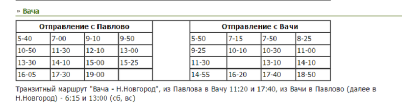 Из Павлова в Вачу ходят прямые автобусы, а также есть транзитные рейсы из Нижнего Новгорода. Уехать в этом направлении вы сможете автостанции с 05:40 до 17:40.