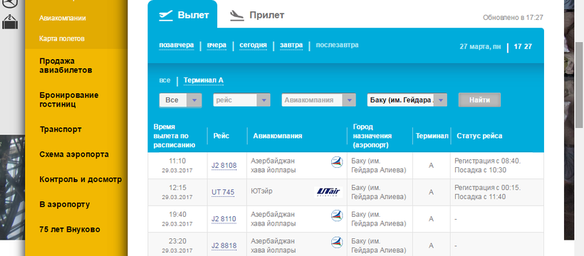Если, к примеру, прилетите во Внуково, то сможете улететь одним из четырех рейсов: