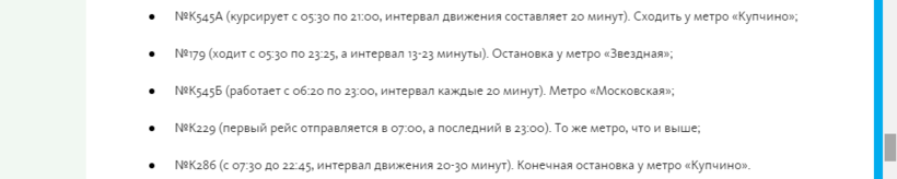 Как видите, проблем с автобусами нет, и вы можете выбрать абсолютно любой маршрут. Также не возникнет сложностей с автобусами до Петергофа: