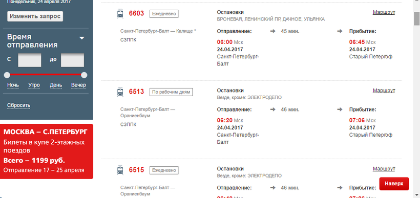 А что касается электричек в Петергоф, то их тоже бывает достаточно много, если говорить о цифрах, то не больше 35 в день (иногда бывают дополнительные рейсы летом). По времени поездка занимает столько же примерно, но это смотря какой поезд, иногда и 50 минут дорога сжирает. Отправка первого рейса происходит в 06:00, а последнего в 23:55. От вокзала до дворца идти пешком минут 5-10.