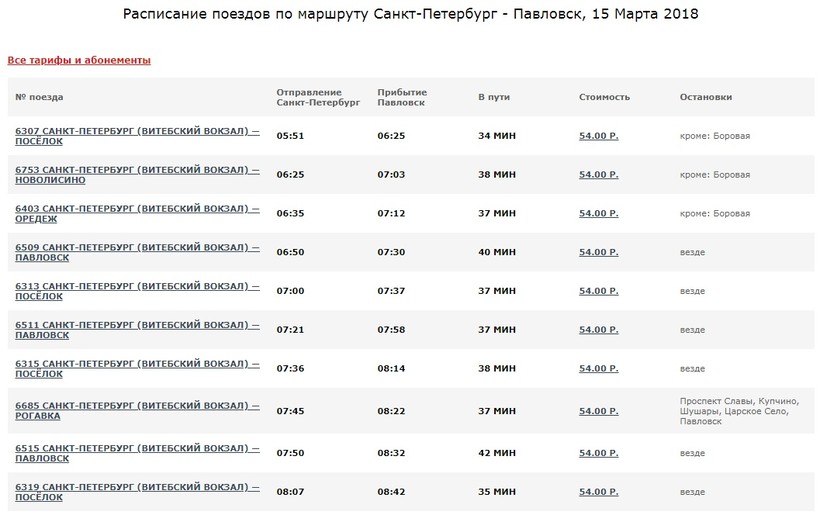 Как видите, электрички ездят постоянно, примерно с 6 утра до 11 вечера. Прибывают на Балтийский вокзал, а вот электрички в Павловск отправляются с Витебского вокзала. Но и тут доехать не проблема, садитесь в метро на станции «Балтиская», которая расположена возле вокзала, проезжаете две остановки, выходите на станции «Пушкинская» и перед вами нужный вокзал.