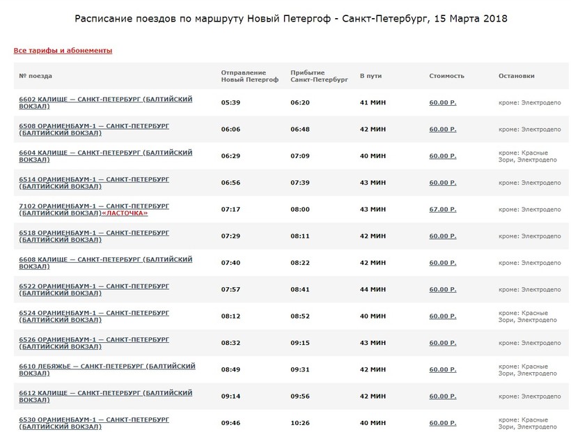 Доехать можно и на электричках, только они останавливаются не так часто, как автобусы. В Петергофе две остановки — Новый и Старый Петергоф. Расписание удобно смотреть на сайте дирекции:
