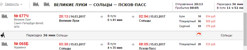 Спланировать маршрут можно если только вы будете знать график, вот, к примеру, вам захотелось поехать завтра, но в этот день будет всего лишь один рейс в Сольцы, который отправится в 20:13. Займет поездка почти 7 часов, так что приготовьтесь к тому, что ночью придется делать пересадку.