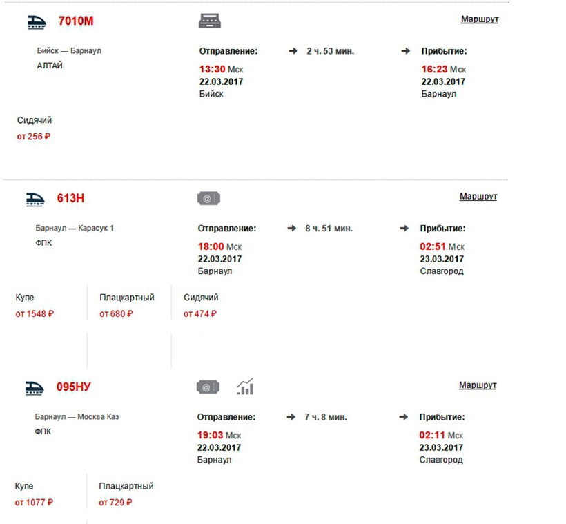 Прямого железнодорожного сообщения между этими населенными пунктами нет. Комбинированный маршрут получается довольно сложный, с множеством пересадок. Сначала нужно доехать на автобусе до Бийска. Затем на поезде 7010М Алтай добраться до Барнаула. Поезд отправляется от ж/д вокзала Бийска в 13:30 (московское время) и прибывает в 16:23 в Барнаул. Полтора часа можно погулять, а в 18:00 от ж/д вокзала Барнаула отправляется поезд 613Н, в Славгород он прибывает в 02:51 (московское время) , то есть в 7 часов утра следующего дня местного времени.