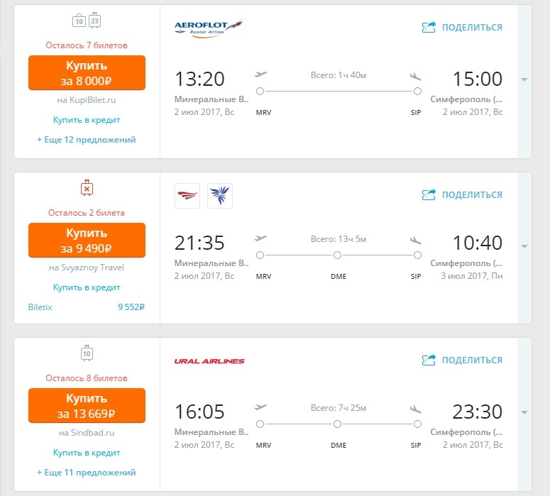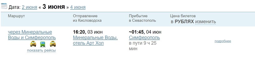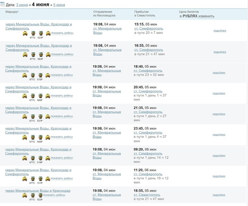 Как видно на скриншоте, большинство рейсов проходит через Минеральные Воды, Краснодар и Симферополь. Рассмотрим их подробнее. Для начала нам нужно прибыть в Минеральные Воды, затем — на поезде в Краснодар (поездка займет 8 часов), дальше — в Симферополь (10 часов), и, наконец, мы в Севастополе. Вся поездка займёт один день. Поезда удобные, имеются места повышенной комфортности.