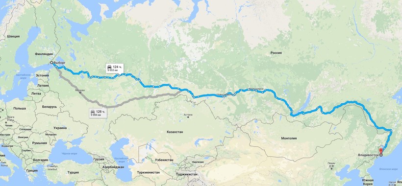 Расстояние между Выборгом и Владивостоком составляет 6 567 километров или 4 081 миля по прямой и 9 219 километров или 5 728 миль по автодорогам.