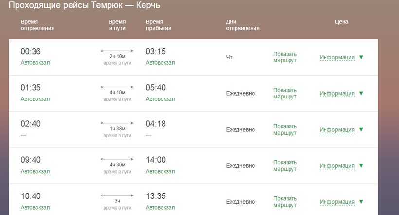 Прямых рейсов из г. Темрюк до Республики Крым не существует. На автовокзале Вы сможете приобрести билеты только на проходящие рейсы. Советую приобретать билеты заранее, особенно в летнее время, ибо по прибытии автобуса может не оказаться свободных мест.