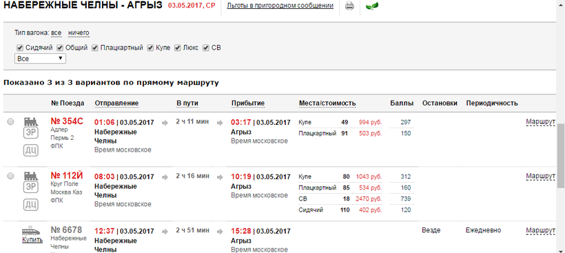 На поезд 405 рублей, а на электричку чуть больше 180 рублей.