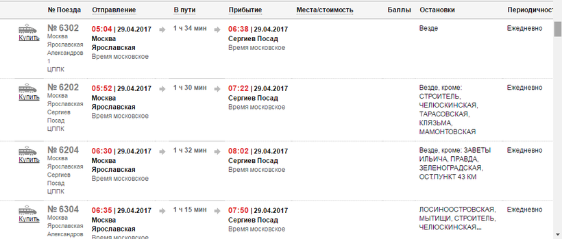 Ну а что касается электропоездов, то ходят они в Сергиев-Посад ежедневно и это, как правило, не меньше 50 рейсов. Первая электричка отправляется рано утром в 05:04, а вот последняя только в 23:53. Ехать не больше 1,5 часа.