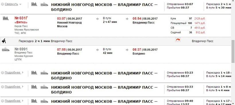 В Дивеево нет железнодорожного вокзала и уехать от него на поезде нельзя. Но если хорошенько подумать, то можно от Нижнего Новгорода доехать (с пересадкой во Владимире) в Болдино. Так что изначально надо садиться на автобус Саров — Нижний Новгород, который работает с 4 утра до 7 вечера. Так за 3 часа вы окажетесь на месте и далее пешком идите на железнодорожный вокзал, от которого ежедневно есть рейсы во Владимир. Первый отправляется еще в 03:07, а последний — только в 17:55. Ехать почти 3 часа.