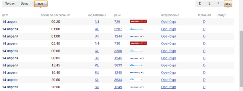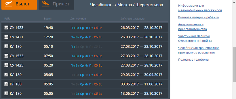Было бы хорошо, если бы можно было долететь в Оренбург прямым рейсом из аэропорта Челябинска. В самом Соль-Илецке нет аэродрома, поэтому маршрут будет таковым: Челябинск – Москва – Оренбург. Выполняются рейсы до Москвы практически ежедневно и до всех трех столичных аэропортов. Однако вам лететь надо в Шереметьево, если не хотите потом еще мотаться из аэропорта в аэропорт. Ниже я приложу скриншот, чтобы вы увидели сезонное расписание и знали когда осуществляются вылеты. Длится перелет 2 часа 20 минут.
