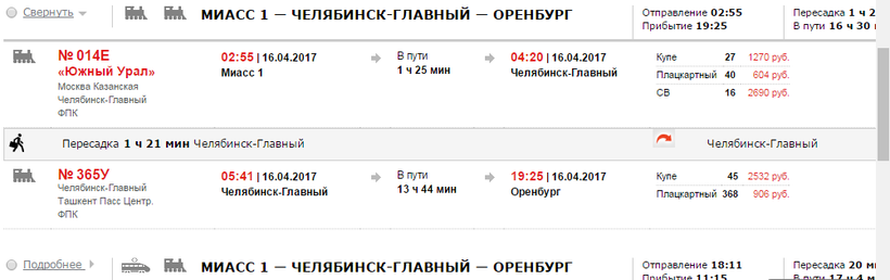От Миасса до челябинского железнодорожного вокзала ехать 1,5 часа, а вот поездка до Оренбурга займет не меньше 14 часов. Стоит отметить, что составы по данному направлению ходят относительно новые и даже порой попадаются фирменные. Когда прибудете в Оренбург, то там все та же схема – ехать в Соль-Илецк на автобусе.