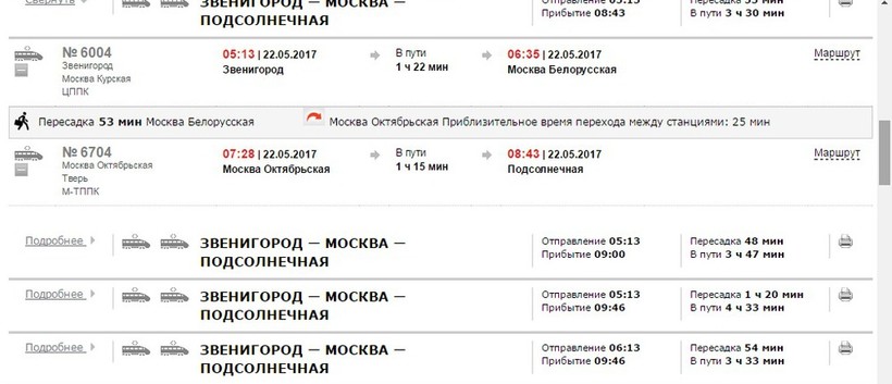 Электропоезда ходят с 5 утра до 9 вечера. Более подробное расписание вам лучше всего глянуть вот здесь. Только учтите, что приехав из Звенигорода, надо сходить на Курском вокзале, а вот до Солнечногорска нужно садиться на Москве Октябрьской (Ленинградский вокзал).