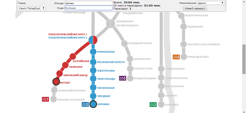 Дорога занимает не больше 30 минут. Ну а далее все просто, так как конец пути будет около метро. От любой из этих станций можно доехать до Купчино, к примеру, если ехать от Автово, то понадобится одна пересадка на Технологическом институте 1 (пересесть на №2).