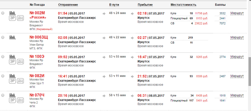 Следующим этапом будет посадка на маршрут Екатеринбург − Иркутск. К счастью, составы ходят несколько раз в день и можно подобрать не только удобное время, но и поезд: