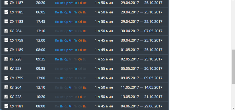 В скобках я обозначила, сколько рейсов отправляется одновременно и, как вы сами можете увидеть, что график вообще неудобный, так как ехать надо либо ночью, либо поздно вечером.