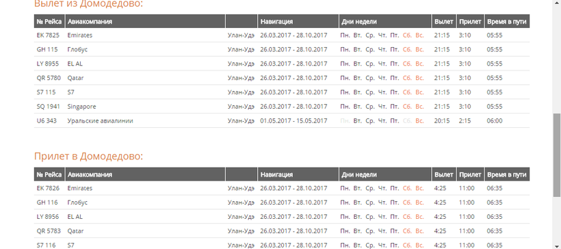 А вот до Улан-Удэ рейсы выполняет только аэропорт Домодедово, причем есть несколько авиакомпаний, среди которых можно выбрать, к примеру, «S7». Рейсы есть ежедневно и в основном они выполняются в 21:15. А вот перелет занимает 6 часов, так что придется потерпеть.