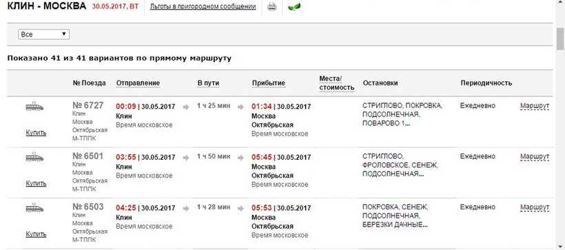 Я не сказала самое главное, что сначала надо добраться в Москву из Клина, а сделать это можно на электропоездах, которые ездят с 00:09 до 23:39. Дорога занимает до 2 часов, так что смотрите, чтобы не опоздать на поезд дальнего следования.