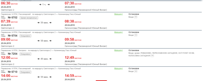 Естественно, что из Светлогорска автобусы до Риги не ходят, они отправляются из Калининграда. Но из Светлогорска до столицы Калининградской области ходит очень много электричек, ехать буквально 40–60 минут. Отправляются они с самого раннего утра и ходят до позднего вечера. Электрички мне понравились, они комфортные и современные. Вот вам маленький фрагмент расписания, с полным можно ознакомиться на официальном сайте РЖД.
