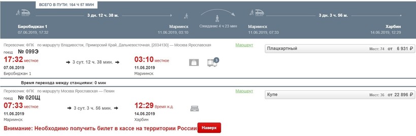Вариант путешествия на поезде до Харбина из Биробиджана существует, но он настолько неудобный и долгий, что расскажу про него вкратце. Прямого поезда нет, добраться можно только с пересадкой, например, в Мариинске. Вот этот вариант.