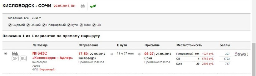 На первый взгляд вариант может показаться слишком сложным, но если вы все взвесите, то поймете, что он хоть и дороже, но в разы надежней автобусного. Здесь можно преодолеть на поезде только часть пути, которая должна вас привести в Сочи. Воспользуйтесь случаем и отдохните денек на море, ведь все равно это будет маленькое приключение. Но вернусь к делу. В Кисловодске надо сесть на поезд, который вас доставит прямо до железнодорожного сочинского вокзала. Ходит он несколько раз в неделю, но по одному разу в 17:50. Дорога ночным рейсом займет 13 часов, а на утро следующего дня в 06:27 вы сможете вдохнуть запах моря.