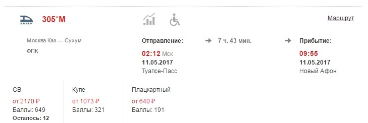 Через Туапсе и Новый Афон проходит пассажирский поезд 305М Москва - Сухум.