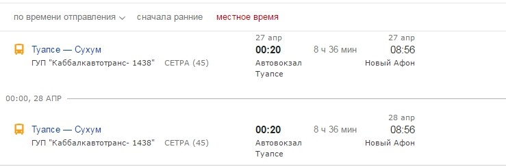 Есть еще один способ проезда между городами - автобус. Ежедневно из Туапсе в Сухум курсируют автобусы, которые останавливаются в Новом Афоне на несколько минут для посадки и высадки пассажиров.