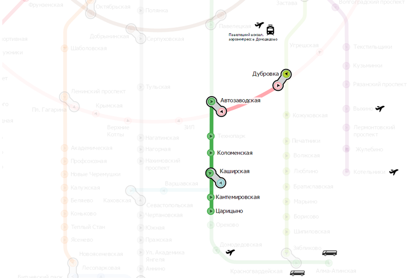 Да и на самом деле, станций метро под названием Дубровка две - одна принадлежит не так давно открытому Московскому центральному кольцу (на схеме - розовый цвет), другая - Люблинско-Дмитровской линии (на схеме - салатовая ветка метро).