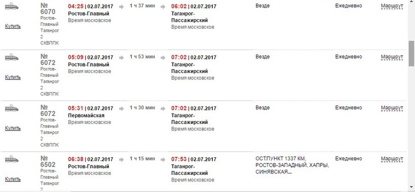 Далее на этом же вокзале придется сесть на состав до Ростова-на-Дону, потому что прямое железнодорожное сообщение с Таганрогом отсутствует. Хорошо хотя бы то, что поезда ходят ежедневно, поэтому сесть можно на один из 4 рейсов: